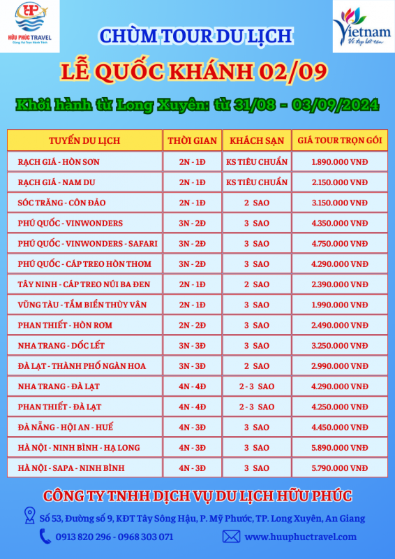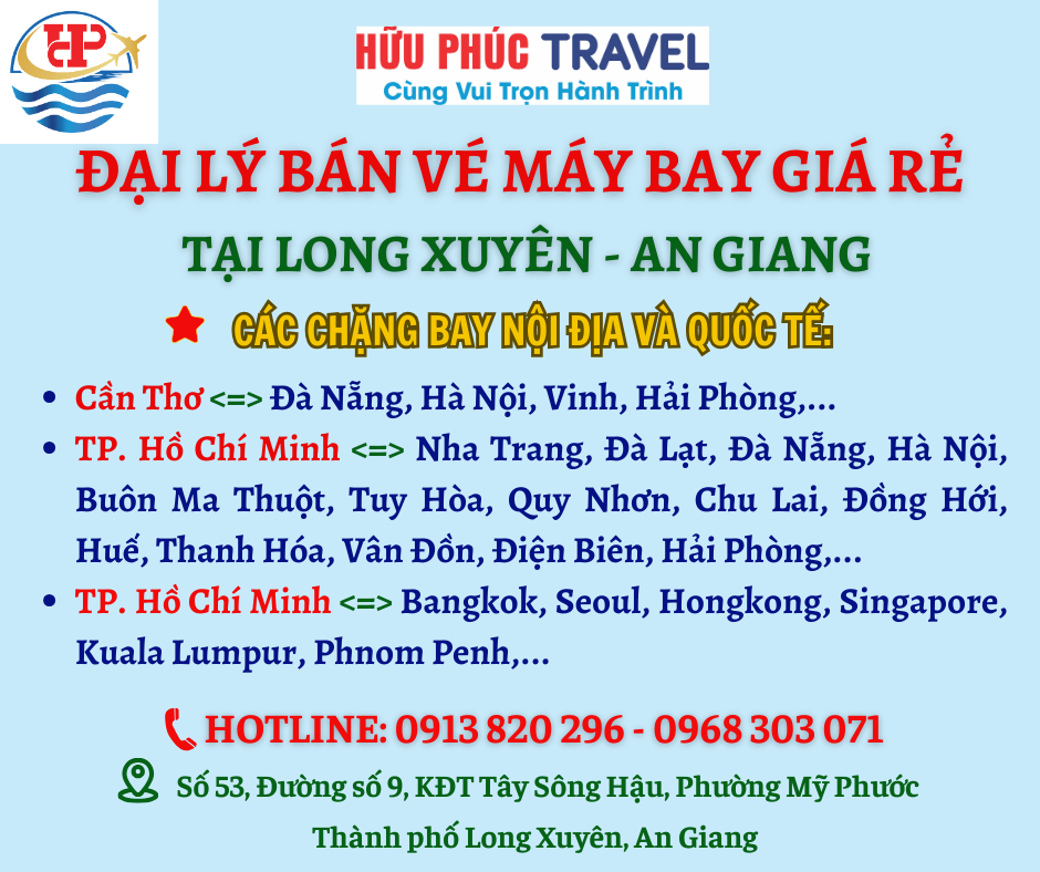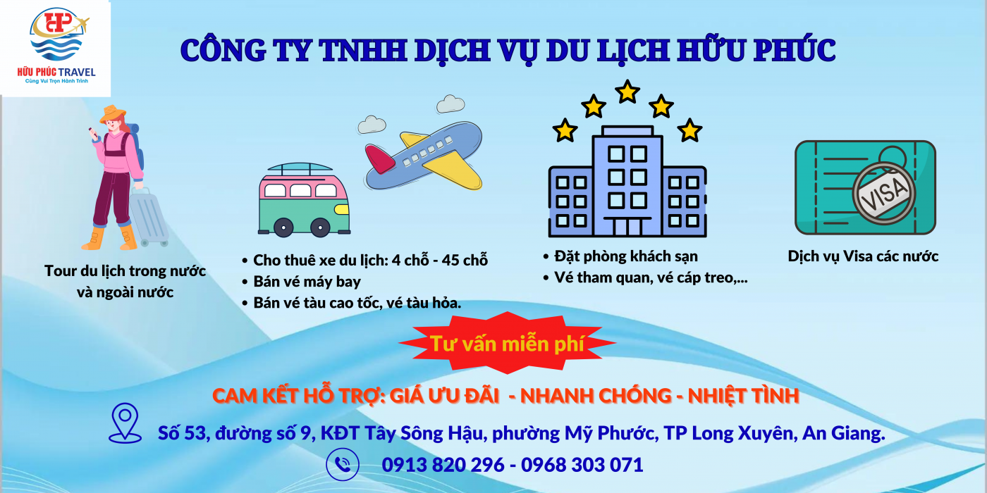Công Ty TNHH Dịch Vụ Du Lịch Hữu Phúc Travel là đơn vị chuyên tổ chức tour du lịch nội tỉnh An Giang (Tour Homestay Cù lao Ông Hổ – Xã Mỹ Hòa Hưng; Tour sông nước Mekong – Chợ nổi Long Xuyên; Tour di chỉ Văn hóa Óc Eo – Vùng Bảy Núi An Giang – Núi Sam – Châu Đốc,…); Tour du lịch trong nước từ Nam ra Bắc; Cho thuê xe du lịch từ 4 đến 45 chỗ; Bán vé máy bay và vé tàu cao tốc đi đảo…