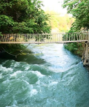 - Vượt cầu treo trên những rạng Si có độ tuổi 300 năm bắt qua những nhánh sông Sêrêpôk dẫn đến ốc đảo Âynô.