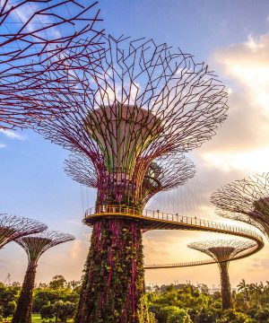 - Kỳ quan Gardens by the Bay (Những khu vườn bên Vịnh) đây là khu vườn nhân tạo rộng hơn 100ha, có hơn 250.000 loài thực vật quý hiếm, với các Siêu cây khổng lồ lấy năng lượng mặt trời vào ban ngày và tỏa sáng vào ban đêm. Từ đây Quý khách có thể chụp hình toàn cảnh “Chiếc du thuyền” nằm ở độ cao 200m trên đỉnh của ba tòa nhà khách sạn Marina Bay Sands.